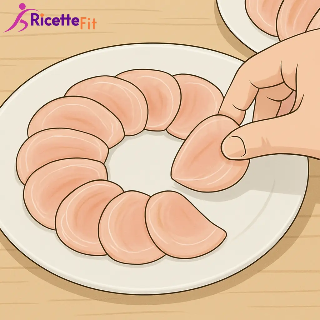 Sistema le fettine su un piatto piano bianco, creando una composizione circolare: parti dal bordo con fette leggermente sovrapposte e chiudi il centro con una fetta più regolare. Mantieni uno spazio pulito sul bordo del piatto.
