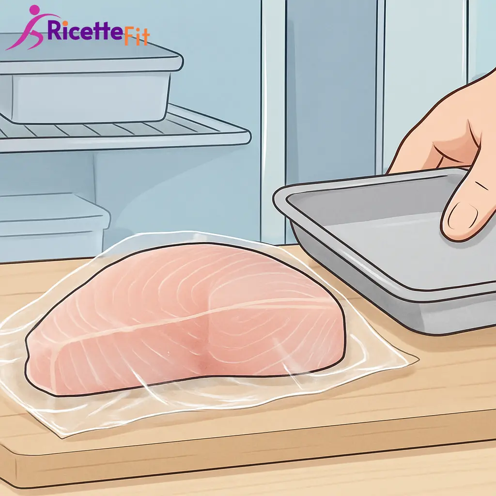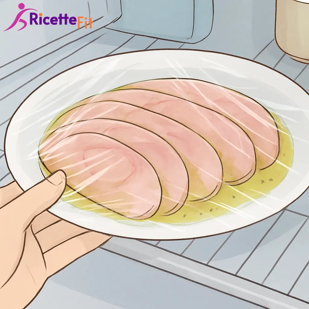 Copri il piatto con pellicola alimentare e lascia riposare in frigorifero per 20 minuti. La superficie deve diventare appena più chiara e lucida, mantenendo il centro rosato e morbido.