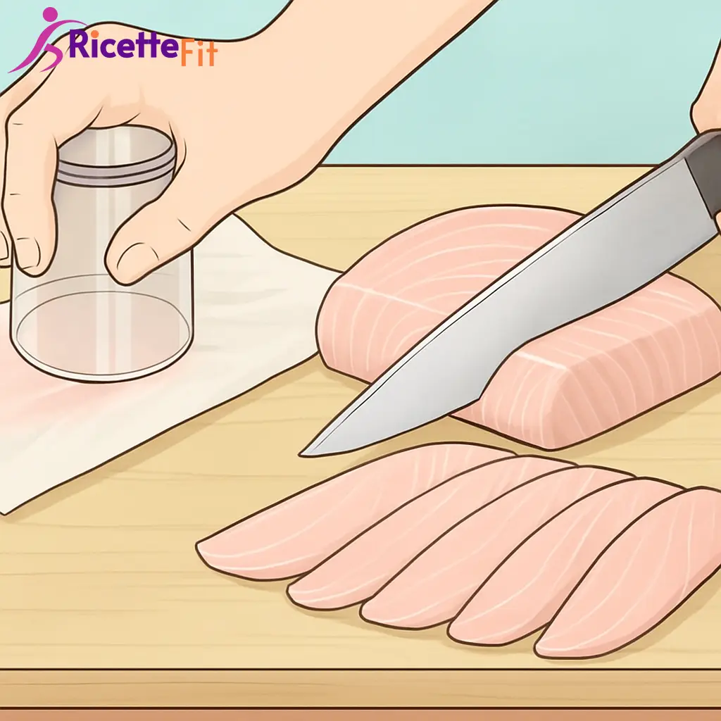 Con un coltello lungo e molto affilato ricava fettine sottili di circa 2 mm. Se alcune risultano più spesse, sistemale tra due fogli di carta forno e appiattiscile delicatamente con il fondo di un bicchiere o con un batticarne liscio.