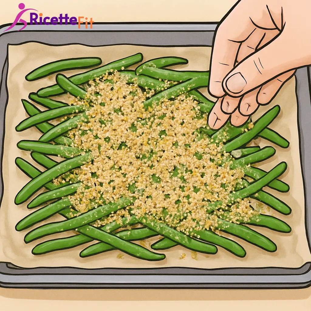 Distribuisci la panatura sopra i fagiolini in modo irregolare, lasciando intravedere il verde. Concentrane un po' di più al centro e sulle estremità per ottenere briciole dorate e punti più croccanti.Cuoci al forno