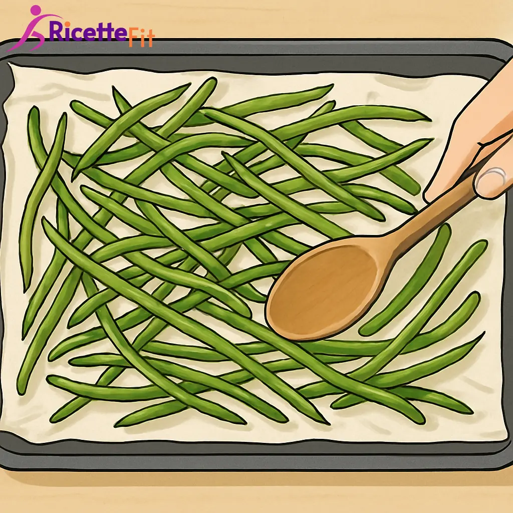 Sistema i fagiolini in una teglia bassa rivestita con carta forno, formando uno strato non troppo spesso. Devono sovrapporsi solo in parte, così alcune punte resteranno visibili e leggermente arrostite.Aggiungi la crosticina