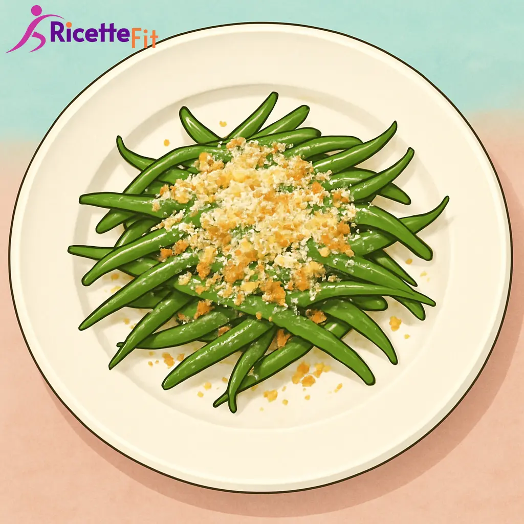 Servi in un piatto piano o leggermente fondo, creando un piccolo cumulo naturale di fagiolini lunghi, verdi e lucidi, con briciole croccanti chiare e dorate distribuite sulla superficie. Completa, se desideri, con una minima spolverata extra di Parmigiano.