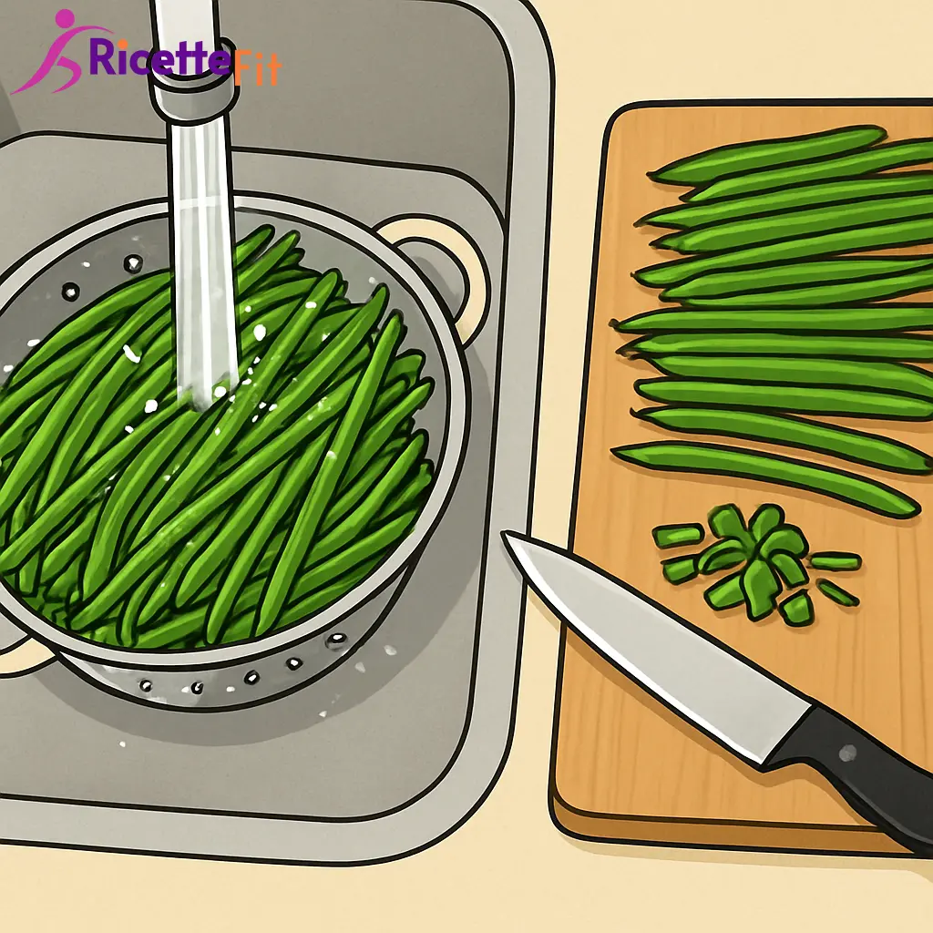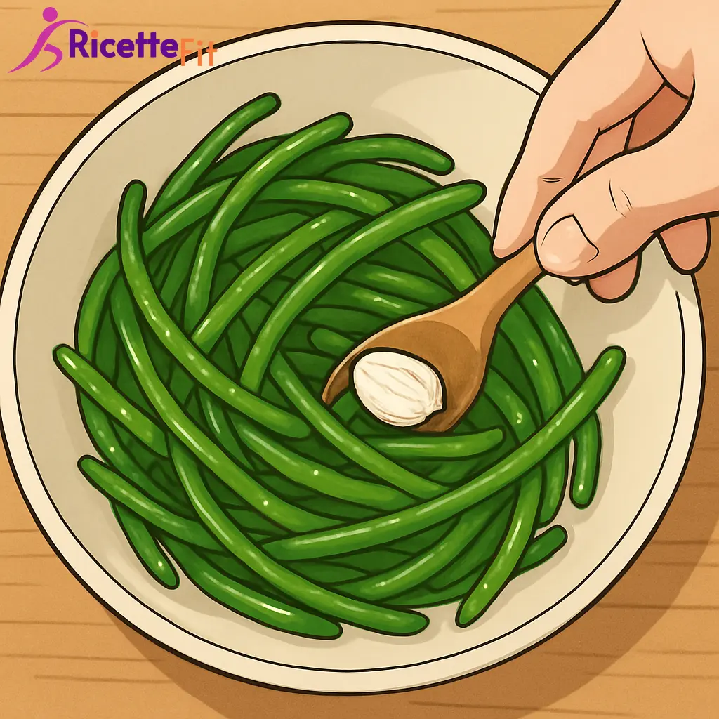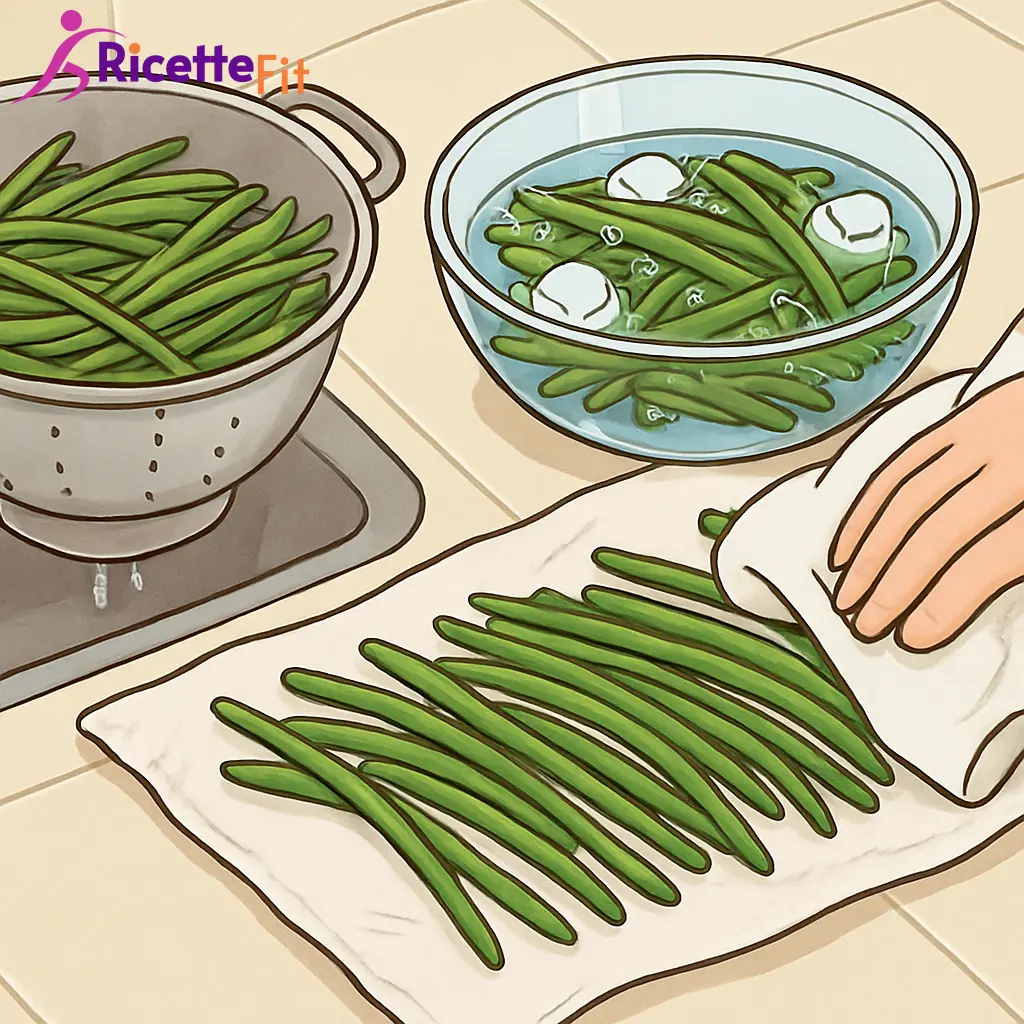Scola i fagiolini e passali per 1 minuto in acqua fredda. Asciugali molto bene con un canovaccio pulito: meno acqua resta in superficie, più la gratinatura sarà dorata e croccante.
