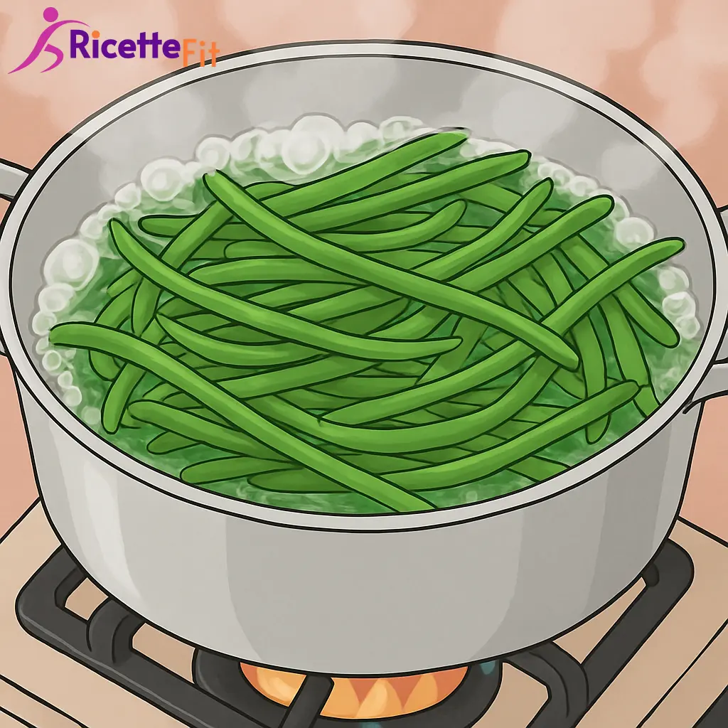 Porta a bollore una pentola d'acqua leggermente salata, immergi i fagiolini e cuocili per 6-7 minuti, finché risultano teneri ma ancora sodi e di colore verde brillante.Raffredda e asciuga