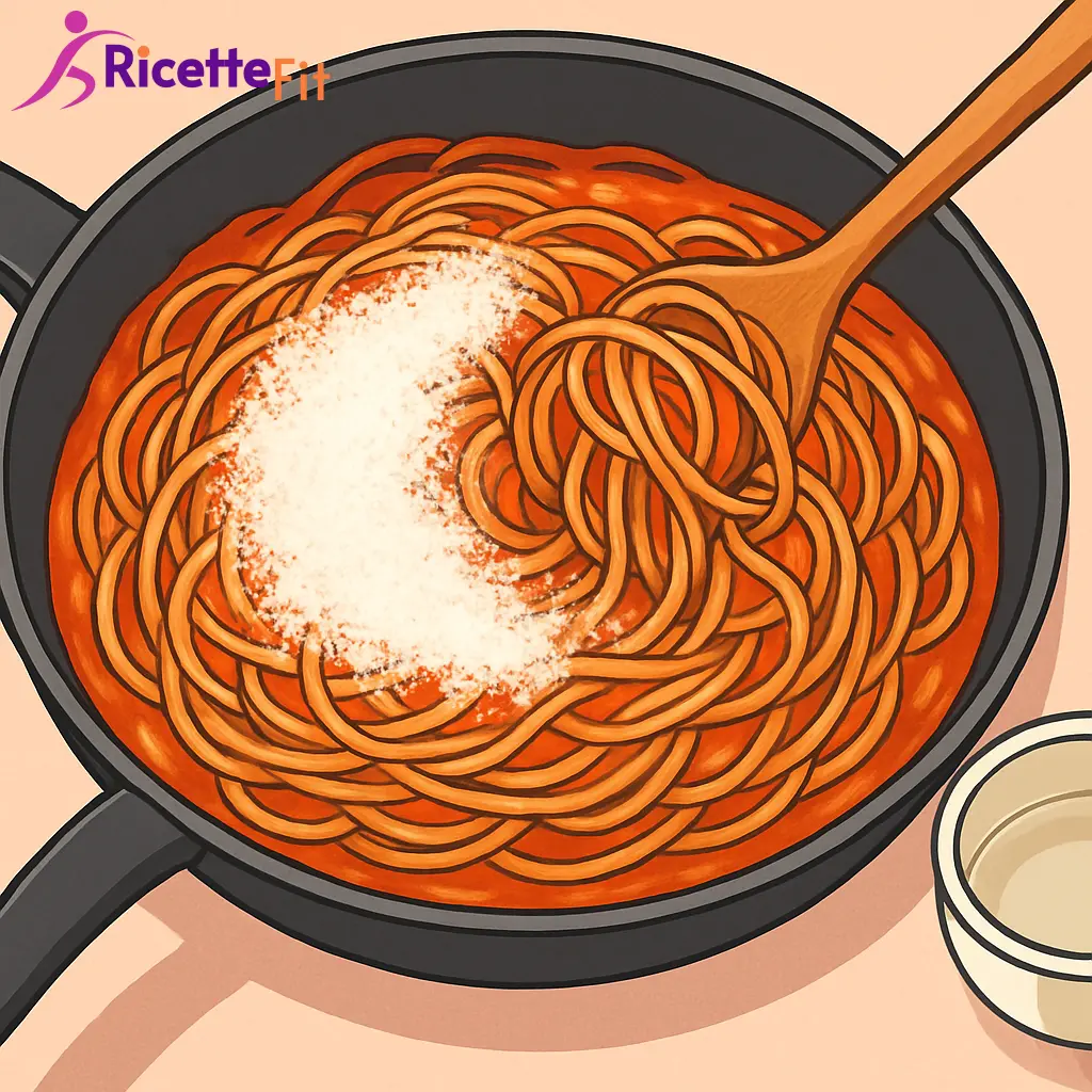 Spegni il fuoco, attendi 30 secondi e aggiungi circa 25 g di pecorino grattugiato. Manteca energicamente con un goccio di acqua di cottura se necessario, così il condimento resta lucido, arancione-rosso e uniforme.