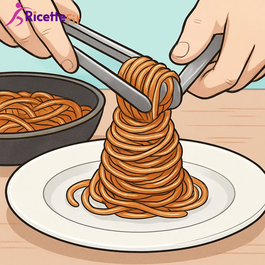 Con un mestolo e una pinza, arrotola ogni porzione di spaghetti formando un nido compatto e alto al centro di un piatto piano chiaro. Lascia che qualche filo di pasta cada naturalmente ai lati per un aspetto abbondante ma ordinato.Completa con guanciale e pecorino