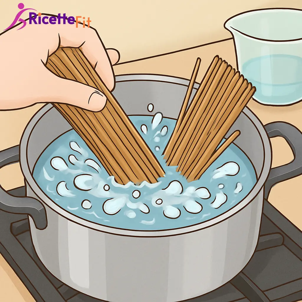 Porta a bollore abbondante acqua, salala moderatamente e cuoci gli spaghetti integrali 1-2 minuti in meno rispetto al tempo indicato sulla confezione. Prima di scolarli, conserva almeno 200 ml di acqua di cottura ricca di amido.Finisci la cottura nel sugo