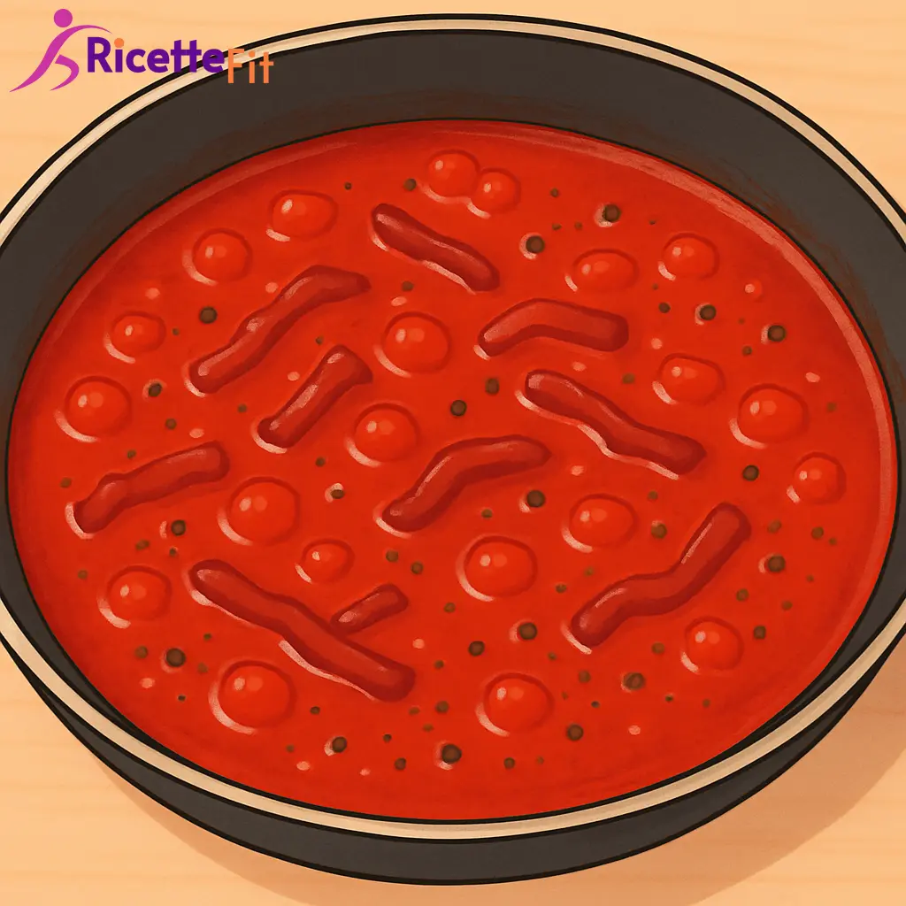 Aggiungi nella padella la passata di pomodoro, il peperoncino e una macinata di pepe nero. Lascia sobbollire a fuoco medio-basso per 12-15 minuti, finché il sugo diventa rosso intenso, lucido e abbastanza denso da avvolgere la pasta. Assaggia prima di aggiungere sale: guanciale e pecorino sono già sapidi.
