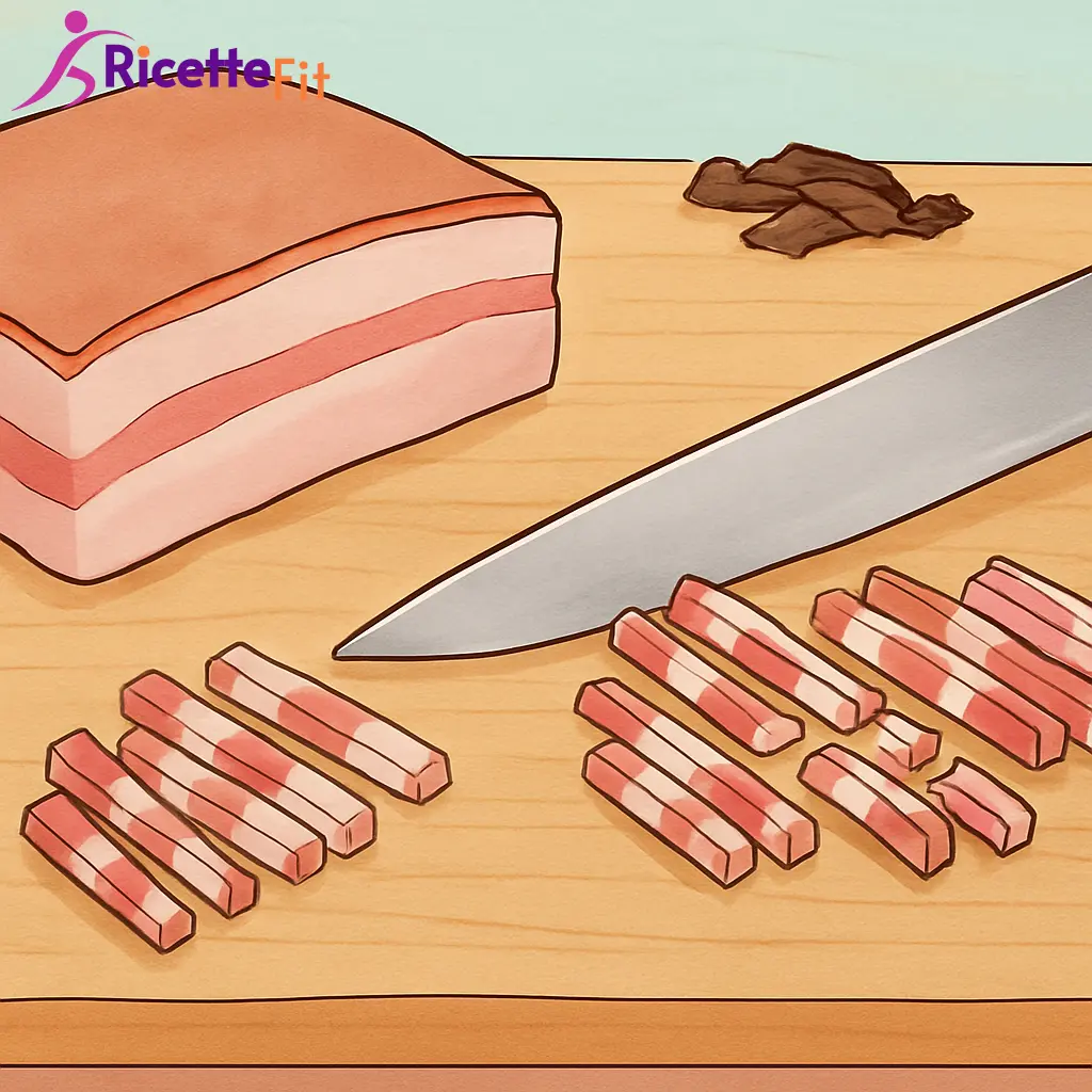Elimina la cotenna e l'eventuale parte esterna troppo speziata, poi taglia il guanciale a listarelle sottili e regolari, lunghe circa 3-4 cm. Questo permette di ottenere pezzi dorati e croccanti fuori, ma ancora leggermente fondenti al centro.Prepara pomodoro e formaggio